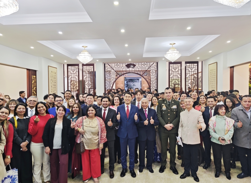 2025年12月12日,驻哥伦比亚大使朱京阳出席2025赴华培训学员鸡尾酒会。使馆张立平公参和高金宝参赞,哥金融监管署长费拉里、农村发展署长帕琼、通信部副部长洛佩斯和国际合作署代署长甘博亚等政要和赴华研修学员、留学生及中企赴华参训员工代表等近300人参加。